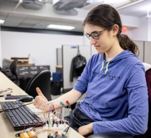 Under the guidance of Dr. Sai Praveen Kadiyala, Birnbaum is building a prototype for a hand exoskeleton that can take surface electromyography (sEMG) signals from the muscles of the arm and use them to move the exoskeleton's fingers. The aim of this work, as they explained at the Katz School’s Symposium on Science, Technology and Health in May, is to create a computational model of complex hand gestures and other fine motor skills for an exoskeleton that will assist in upper-limb rehabilitation.